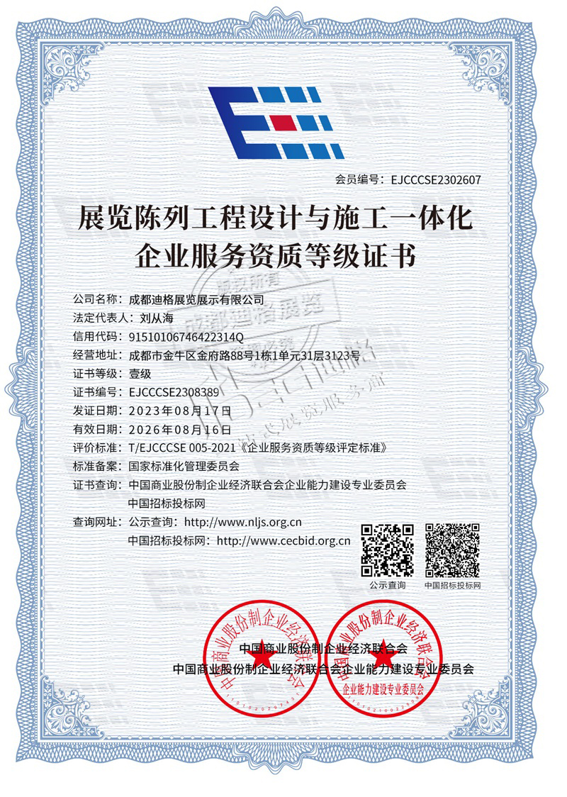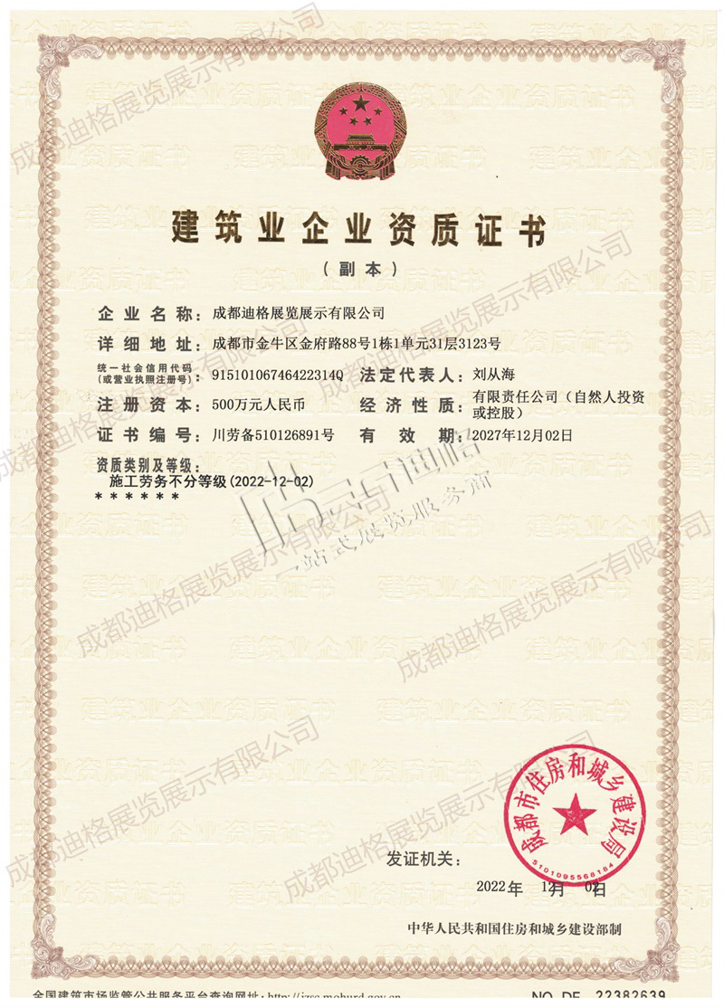成都迪格展覽展示有限公司成立于2003年,二十余年來深耕展覽,有建筑業(yè)勞務和安許資質,是展覽陳列工程設計與施工一體化壹級企業(yè),也是四川省會議展覽業(yè)協(xié)會,成都市會議展覽業(yè)協(xié)會,會展聯(lián)盟等的會員單位。是致力于展會設計搭建、企業(yè)展廳、活動會議巡展、環(huán)保器材租賃為一體的“一站式服務商”。