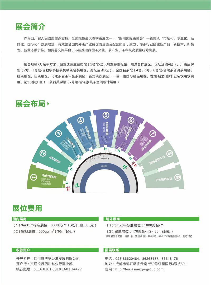 本屆展會7萬余平方米,設(shè)置有達(dá)州主題市館(1號館-含天府龍芽地標(biāo)館、川渝合作展區(qū)、論壇活動A區(qū))、川茶品牌館(2號、3號館-含數(shù)字科技茶機(jī)械茶包裝展區(qū)、論壇活動B區(qū))、全國名茶館(4號、5號、6號館-含黑茶普洱茶展區(qū)、紅茶展區(qū)、白茶展區(qū)、烏龍茶巖茶單樅茶展區(qū)、新式茶飲展區(qū)、一帶一路國際精品展區(qū)、香煙·名酒·咖啡·包裝飲用水展區(qū)、論壇活動C區(qū))、茶器美學(xué)館(7號館-含茶家具茶空間設(shè)計(jì)展區(qū))